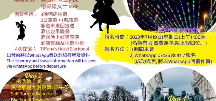 黑池 湖 光 舞 影 (2023/09/18 – 22) - 5日4夜 雙人房每位 £350 / 單人房每位 £390 行程包括: 夜賞黑池燈飾 暢遊英國著名湖區 (Lake District) 漫遊英格蘭名城利物浦 (Liverpool) 黑池華麗舞池入場+下午茶(自費項目) (出發前將以 WhatsApp 發送詳細行程及資料) 團費包括:4晚酒店住宿, 2日旅遊 +1 晚夜遊 旅遊車來回接送 …
