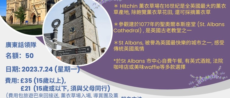 又到薰衣草花季,7、8月是英國薰衣草花季, 係時候去睇紫色花海了. ICA 在7月24日(星期一) 舉辦仲夏.薰FUN遊 @Hertfordshire, 暢遊Hitchin 薰衣草場及聖奧爾本斯 St Albans 1日遊. 活動詳情如下: It’s Lavender Season in London now!! ICA is going to organize a One Day Tour to Hertfordshire visiting Hitchin Lavender Farm and St. Albans. Below is the tour details: 日期 Date: 2023年7月24日 (星期 一) 24 July 2023 (Monday) 時間 Time: 09:00 - 19:00 遊覽地點 Points of…