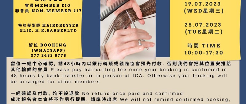 7月份剪髮服務 Haircutting Service in July 7月份剪髮服務又來啦! 來自香港的髮型師 Eliz 今個月會於7月19日(星期三)及7月25日(星期二) 在中心為會員剪髮. 剪髮服務由早上10時至下午5時30(最後預訂時間為下午5時) , 兩天名額各15個,會員£10,非會員£17。 請Whatsapp 07724828778 預約 ,先到先得,額滿為止。 另外, 由於剪髮服務需求越來越大, 為免因臨時缺席而浪費名額, 我們現要求已留位會員在48小時內以銀行轉賬或親臨協會預先付款. 否則我們會把其位置安排給其他輪候的會員。多謝大家合作! Haircutting Service is available on 19 July (Wed) and 25 July (Tue) from 10:00 to 17:30 (last booking is at 17:00) by the experienced hair stylist, Eliz. 15 quotas available respectively on 19th…