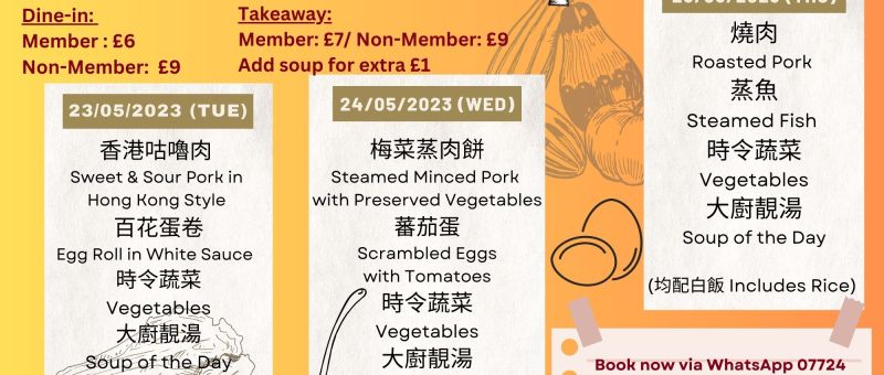 下星期菜單準備好了!當天上午11:30前記得 WhatsApp 07724 828778 留位啦! The latest Lunch Menu is ready! Remember to WhatsApp 07724 828778 and reserve your seat before 11:30 am on the day. 23/05/2023 (星期二Tue)香港咕嚕肉 Sweet & Sour Pork in Hong Kong Style百花蛋卷 Egg Roll in White Sauce時令蔬菜 Vegetables大廚靚湯 Soup of the Day 24/05/2023 (星期三Wed)梅菜蒸肉餅 Steamed Minced Pork with Preserved Vegetables蕃茄炒蛋 Scrambled…