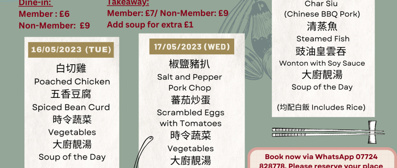 新一期菜單上場啦!當天上午11:30前記得 WhatsApp 07724 828778 留位啦! The latest Lunch Menu is ready! Remember to WhatsApp 07724 828778 and reserve your seat before 11:30 am on the day. 02/05/2023(星期二Tue) 鹵水雞 Chicken in Chinese Marinade 粟米蓉魚片 Fish Fillet in Sweet Corn 時令蔬菜 Vegetables 大廚靚湯 Soup of the Day 03/05/2023(星期三Wed) 咖哩雞翼魚蛋 Chicken Wings and Fish Ball in Curry Sauce…