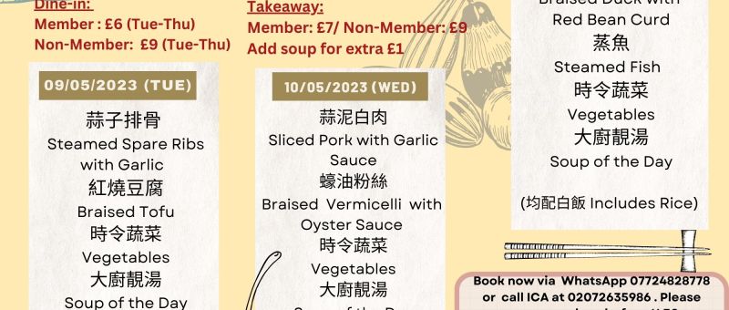 下星期菜單準備好了!當天上午11:30前記得 WhatsApp 07724 828778 留位啦! The latest Lunch Menu is ready! Remember to WhatsApp 07724 828778 and reserve your seat before 11:30 am on the day. 09/05/2023(星期二Tue) 蒜子排骨 Steamed Spare Ribs with Garlic 紅燒豆腐Braised Tofu 時令蔬菜 Vegetables 大廚靚湯 Soup of the Day 10/05/2023(星期三Wed) 蒜泥白肉Sliced Pork with Garlic Sauce 蠔油粉絲Braised Vermicelli with Oyster Sauce 時令蔬菜Vegetables 大廚靚湯Soup…