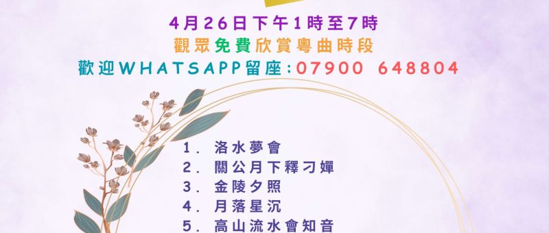4月26日 (今個星期六) 下午1:00至7:00又是觀眾免費欣賞粵曲時段,現場音樂伴奏。 依士靈頓開心粵曲組誠邀喜愛粵曲的你前來觀賞,留座請 WhatsApp 07900 648804。地點:ICA一樓大堂 (21 Hatchard Road, London N19 4NG)。 粵曲欣賞曲目次序如下,曲目或次序如有更改 ,恕不另行通知。🪕🪈🎤🎼🎼🎤🪈🪕 洛水夢會 關公月下釋刁嬋 金陵夕照 月落星沉 高山流水會知音 夢會太湖 風雪情 血濺未央宮 湖山盟 絕唱胡笳十八拍 風雪情 梁紅玉擊鼓退金兵 The Islington Cantonese Opera Group cordially invites those Cantonese operatic song’s lovers to come and join its free appreciation session with live music this Saturday, 26 April, from…