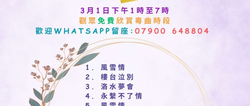 3月1日 (今個星期六) 下午1:00至7:00又是觀眾免費欣賞粵曲時段,現場音樂伴奏。 依士靈頓開心粵曲組誠邀喜愛粵曲的你前來觀賞,留座請 WhatsApp 07900 648804。地點:ICA一樓大堂 (21 Hatchard Road, London N19 4NG)。 粵曲欣賞曲目次序如下,曲目或次序如有更改 ,恕不另行通知。🪕🪈🎤🎼🎼🎤🪈🪕 風雪情 樓台泣別 洛水夢會 永繫不了情 風雪情 殺忠妻 十繡香囊 黛玉悲秋 忍辱未忘家國恨 碎鑾輿 重台泣別 悲怨別重台 The Islington Cantonese Opera Group cordially invites those Cantonese operatic song’s lovers to come and join its free appreciation session with live music this Saturday, 1 March, from…