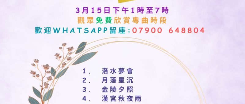3月8日 (今個星期六) 下午1:00至7:00又是觀眾免費欣賞粵曲時段,現場音樂伴奏。 依士靈頓開心粵曲組誠邀喜愛粵曲的你前來觀賞,留座請 WhatsApp 07900 648804。地點:ICA一樓大堂 (21 Hatchard Road, London N19 4NG)。 粵曲欣賞曲目次序如下,曲目或次序如有更改 ,恕不另行通知。🪕🪈🎤🎼🎼🎤🪈🪕 漢宮秋夜雨 月落星沉 大審 同是天涯淪落人 別館驪歌 十繡香囊 同是天涯淪落人 古渡離愁 洞庭十送(綜合) 絕唱胡笳十八拍 血濺未央宮 梵台續情絲 The Islington Cantonese Opera Group cordially invites those Cantonese operatic song’s lovers to come and join its free appreciation session with live music this Saturday, 8 March, from…