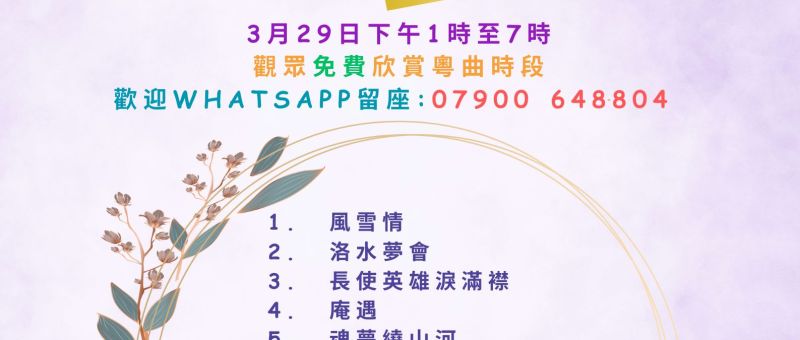 3月29日 (今個星期六) 下午1:00至7:00又是觀眾免費欣賞粵曲時段,現場音樂伴奏。 依士靈頓開心粵曲組誠邀喜愛粵曲的你前來觀賞,留座請 WhatsApp 07900 648804。地點:ICA一樓大堂 (21 Hatchard Road, London N19 4NG)。 粵曲欣賞曲目次序如下,曲目或次序如有更改 ,恕不另行通知。🪕🪈🎤🎼🎼🎤🪈🪕 風雪情 洛水夢會 長使英雄淚滿襟 庵遇 魂夢繞山河 高山流水會知音 琵琶行 良朋 艷曲醉周郎 琵琶淚 劫後描容 鳳閣恩仇未了情 The Islington Cantonese Opera Group cordially invites those Cantonese operatic song’s lovers to come and join its free appreciation session with live music this Saturday, 29 March, from…