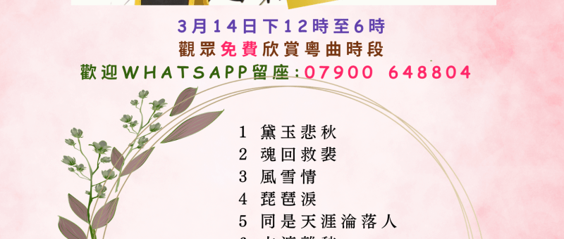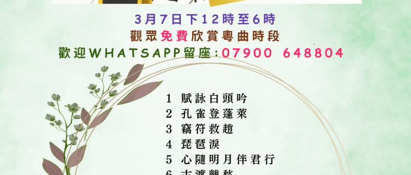 📢 粵曲欣賞免費活動|依士靈頓開心粵曲組 🎭 日期:2026年3月14日(星期六)🕛 時間:中午12:00 至 下午6:00📍 地點:ICA 上層禮堂(Upper Hall) 21 Hatchard Road, London N19 4NG 🎶 現場樂隊伴奏,觀眾免費入場欣賞!依士靈頓開心粵曲組誠邀喜愛粵曲的你前來觀賞! 📲 *留座請 WhatsApp *:07900 648804 🪕🪈🎤🎼🎼🎤🪈🪕 🎼 曲目次序如下(如有更改,恕不另行通知): 1 黛玉悲秋2 魂回救裴3風雪情4 琵琶淚5 同是天涯淪落人6古渡離愁7 越國驪歌8藏域鶯歌萬里情9 追妻10 摘纓會11 去國題詞12 竊符救趙 📢 Free Cantonese Opera Appreciation Event|Islington Happy Cantonese Opera Group 🎭 Date: Saturday, 14 March 2026🕛 Time: 12:00 – 6:00…