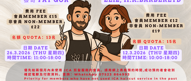 春日煥新|ICA 2026年3月剪髮服務 氣溫回暖,春意漸濃,換個清爽新造型,迎接明媚三月。精神煥發,由「頭」開始。 特約髮型師:Eliz (H.K. Barber Ltd) 日期:12.3.2026(星期四) 時間:10:00 – 18:00 費用:會員 £12 | 非會員 £19 名額:15名 特約髮型師:發哥 Fat Gor 日期:26.3.2026(星期四) 時間:11:00 – 18:00 費用:會員 £15 | 非會員 £22 名額:13名 報名表格: https://form.jotform.com/260614009723350網上表格可直接選擇時段,如填寫上有困難,歡迎 WhatsApp 中心協助。 查詢:WhatsApp 07523 864993 注意:一經付款確認,恕不退款;如未能出席將作棄權處理。 Spring Refresh | ICA March 2026 Haircut Service As the weather gets warmer and spring approaches,refresh your…