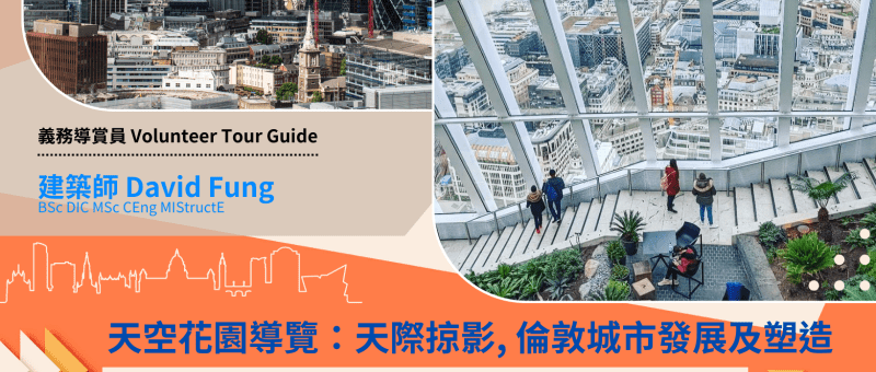 Sky Garden是倫敦最高的公共花園,可以360度觀賞倫敦的景色及視野。我們的義務導賞員將解釋倫敦市的發展和規劃,以及富有特色的高層建築。歡迎來加入我們,享受一個放鬆愉快的下午!Sky Garden is London’s highest public garden – a vibrant social space offering 360-degree views of the city’s iconic skyline. It provides a spectacular viewpoint to experience London. Our volunteer tour guide will explain the development and planning of the City of London, as well as the shapes of various high-rise buildings. Come and…