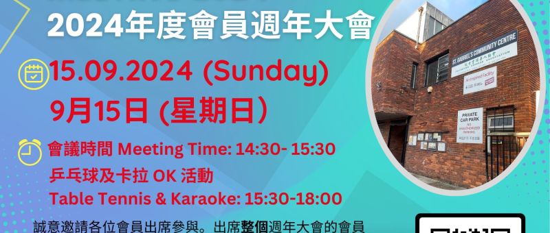 依士靈頓華人協會將於2024年9月15日(星期日)下午二時半至三時半在中心舉行週年大會。 誠意邀請各位會員出席參與。會後有免費茶點、乒乓球及卡拉 OK 活動至下午6:00, 招待出席整個週年大會的會員。 若閣下有意出席, 請於9月6日前填寫Google Form https://bit.ly/4dpK4R5 熱切期望各位會員能夠出席參與。 如閣下當天忙碌無法親自岀席, 請填妥委託書, 委託出席會員代為投票。委託書表格可向中心辦公室索取。 ICA’s Annual General Meeting ("AGM") will be held on 15th September (Sunday) at 2.30 p.m. to 3.30 p.m. For those members who attend the entire AGM, we will provide free light refreshment together with free activities of table tennis and karaoke after AGM…