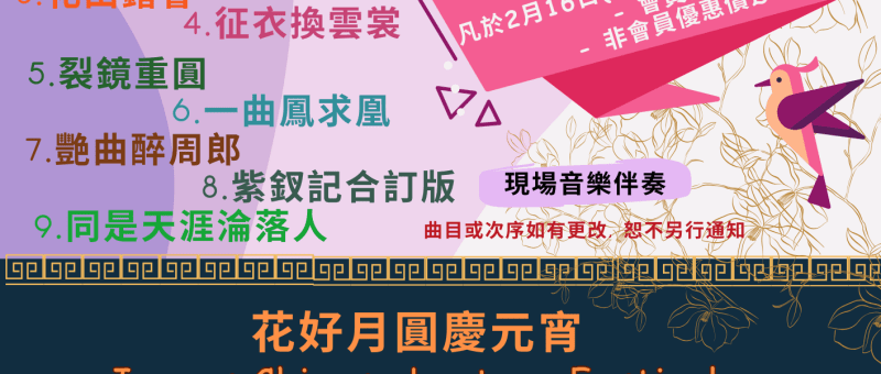 [早鳥優惠 Early Bird Offer] 粵曲茶聚「 花好月圓慶元宵」(2024年2月24日) Cantonese Opera Tea Gathering “Joyous Chinese Lantern Festival” (24 February 2024) (Saturday)