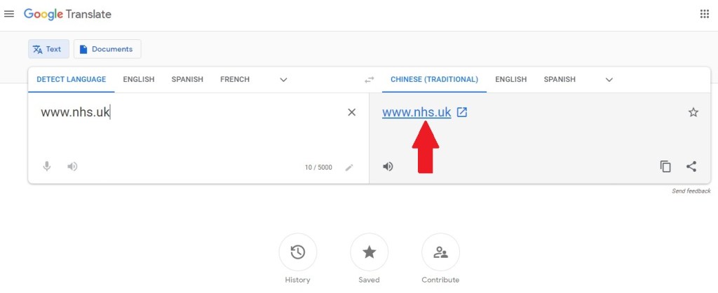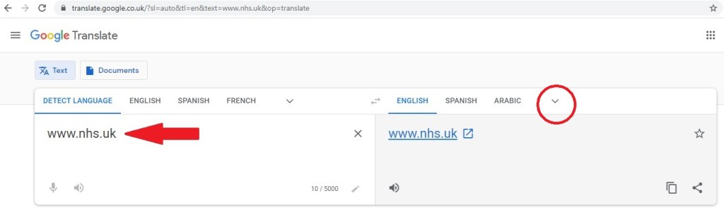 (2) Once you are in the “Google Translate” website, type the target website into the left hand side box. In this example we have typed in the NHS site address. Click on the pull down menu on the top of the right hand side box (circled in red in the diagram below).