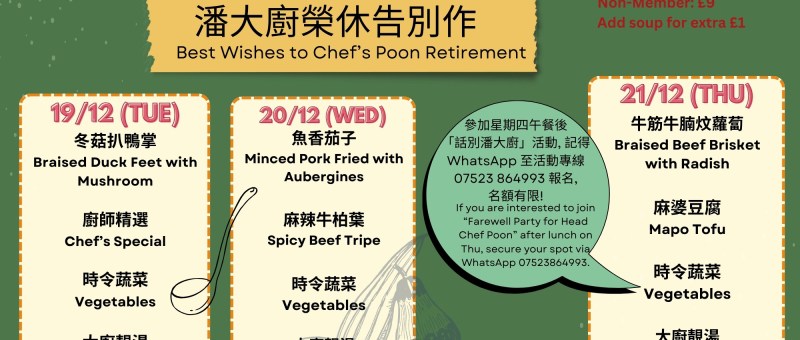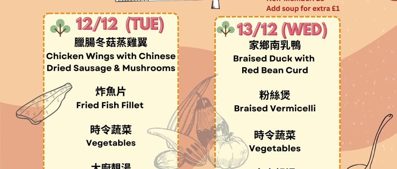下星期菜單準備好了!當天上午11:30前記得 WhatsApp 07724 828778 留位啦! The latest Lunch Menu is ready! Remember to WhatsApp 07724 828778 and reserve your seat before 11:30 am on the day. 12/12/2023 (星期二 Tue)臘腸冬菇蒸雞翼 Chicken Wings with Chinese Dried Sausage & Mushrooms炸魚片 Fried Fish Fillet時令蔬菜 Vegetables大廚靚湯 Soup of the Day 13/12/2023 (星期三 Wed)家鄉南乳鴨 Braised Duck with Red Bean Curd粉絲煲 Braised…