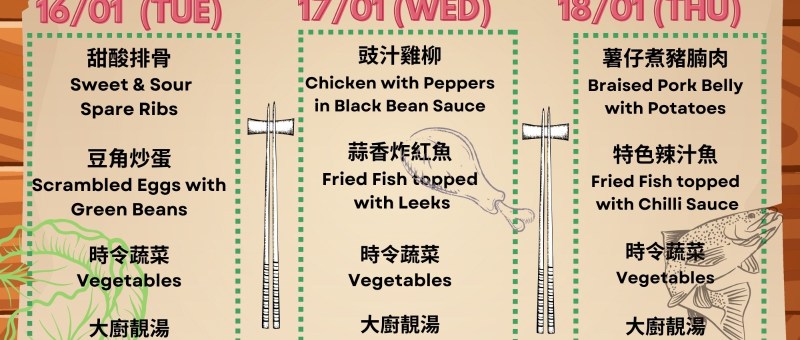 下星期菜單準備好了!當天上午11:30前記得 WhatsApp 07724 828778 留位啦! The latest Lunch Menu is ready! Remember to WhatsApp 07724 828778 and reserve your seat before 11:30 am on the day. 16/01/2024 (星期二 Tue)甜酸排骨 Sweet & Sour Spare Rib豆角炒蛋 Scrambled Eggs with Green Beans時令蔬菜 Vegetables大廚靚湯 Soup of the Day 17/01/2024 (星期三 Wed)豉汁雞柳 Chicken with Peppers in Black Bean Sauce蒜香炸紅魚 Fried…