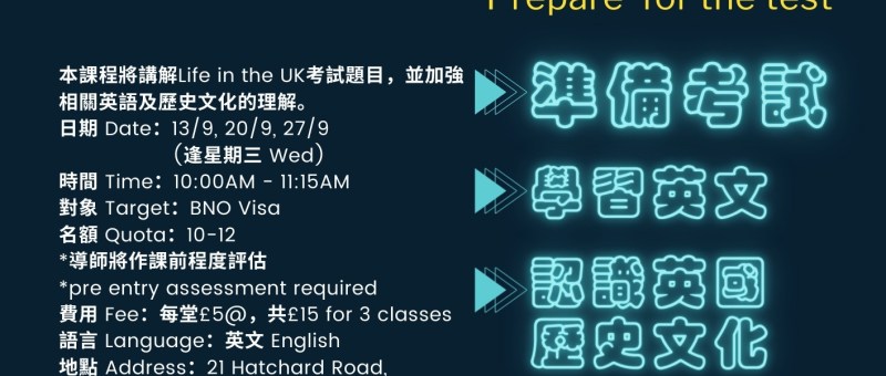 由英國資深教育顧問,為大家解答升學疑難,親授英國教育路上的種種要訣。歡迎家長與11歲以上子女參加!Delivered by experienced UK education consultants, this seminar will provide answers to your academic questions and share valuable tips for your educational journey in the UK. Parents and children aged 11 and above are welcome to join us!日期 Date: 16 Sep 2023 (Sat)時間 Time: 2:00pm to 5:30pm語言 Language: 廣東話 Cantonese地點 Venue: 依士靈頓華人中心 Islington Chinese Association…